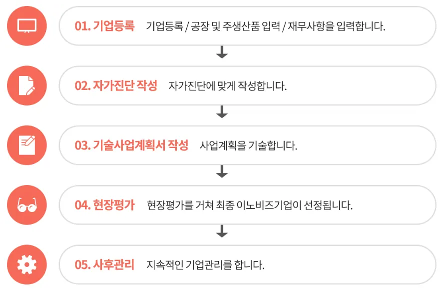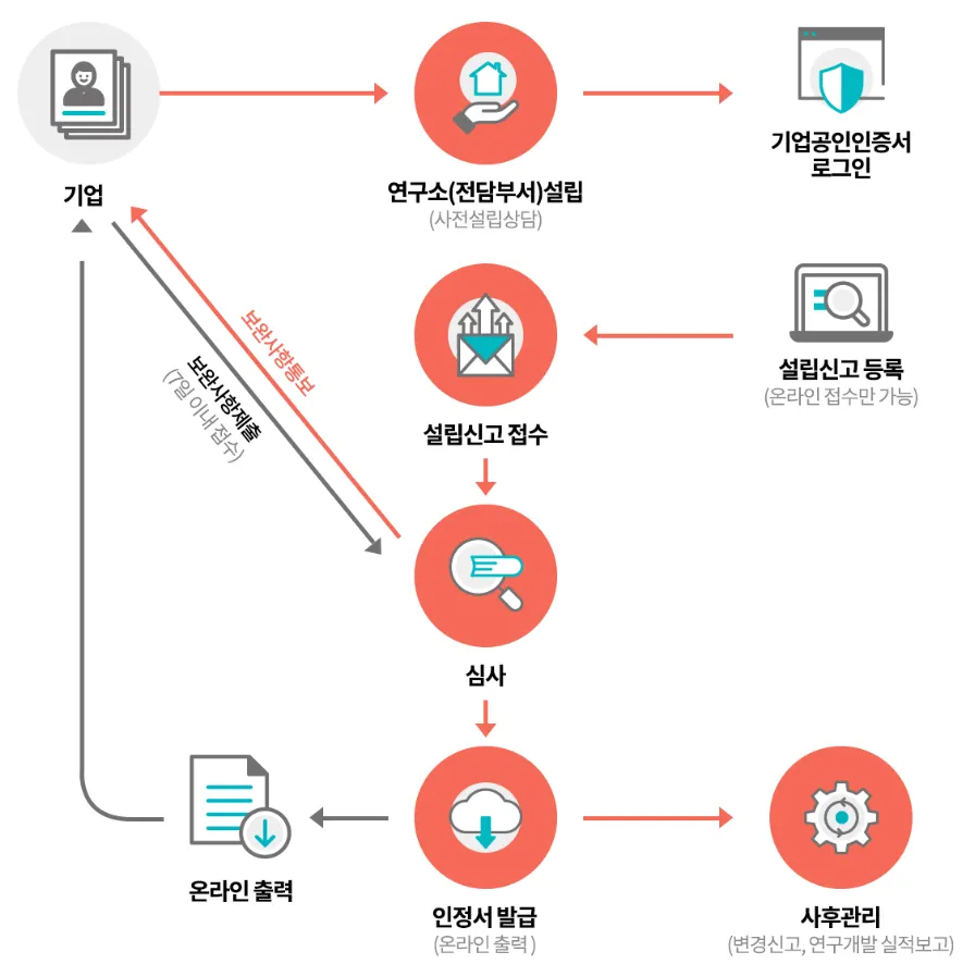 연구소/전담부서 설립 및 운영→연구소/전담부서 설립신고서류 작성→서류접수 및 운영상담→인정서/확인서 발급→사후관리