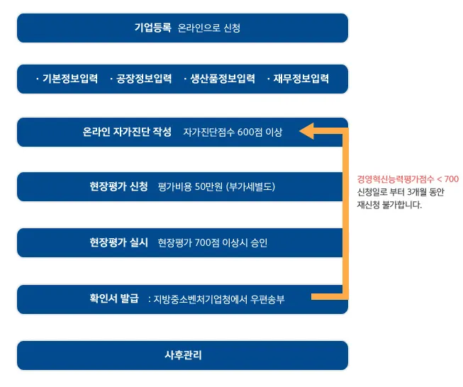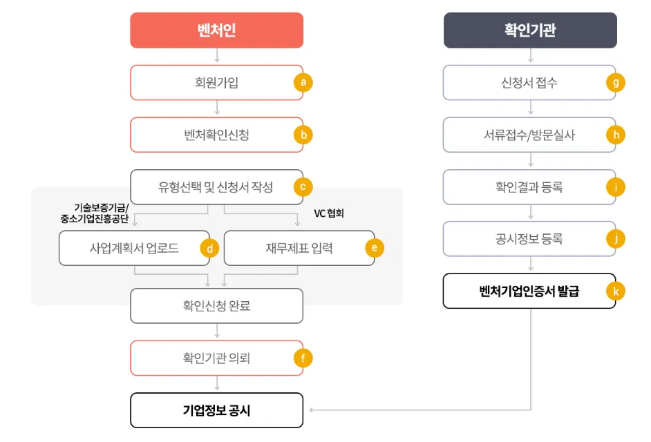 벤처인(회원가입)→벤처확인 신청(사업계획서 업로드/재무제표 입력)→서류접수/방문실사 → 벤처기업인증서 발급