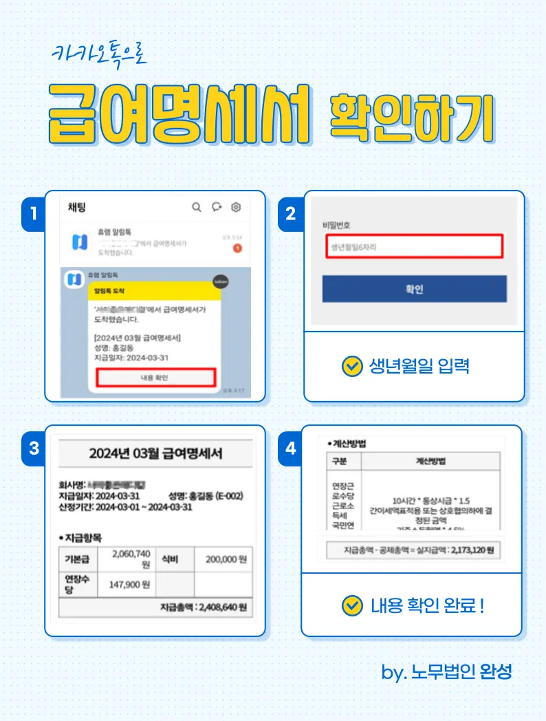 노무법인 완성의 카카오톡 또는 이메일로 임금명세서를 발송해드리고, 직원이 직접 확인할 수 있습니다.